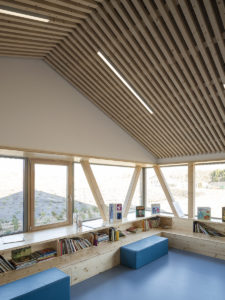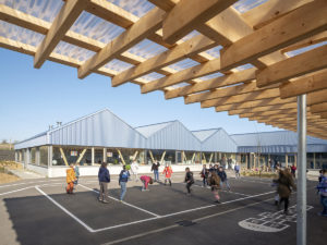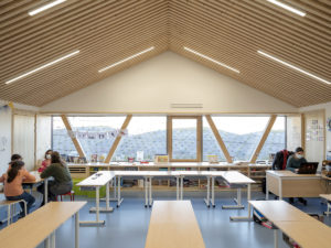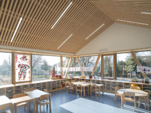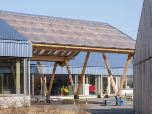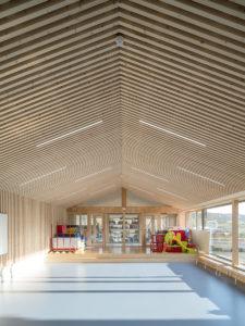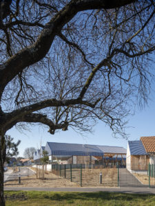 Le projet de regroupement scolaire est l’occasion de structurer une emprise peu qualifiée entre les deux communes d’Anzeling et Edling. L’ensemble du groupe scolaire est organisé comme un nouvel espace public, lieu d’échanges et d’extensions possibles. L’échelle du village donne la mesure à cet équipement par son intégration urbaine et paysagère en prolongeant le bourg dans sa typologie de « village-rue ». La volumétrie basse et étirée, le jeu de toiture à deux pans ainsi que l’implantation de l’aile maternelle en front de rue illustrent cette intention. Une certaine porosité est créée vis-à-vis du quartier de manière à faire émerger la vie de l’école vers l’extérieur, sans nuire à la tranquillité du voisinage et des enfants. La cours élémentaire s’ouvre sur la rue et son préau offre un abris-bus tandis que celle des maternelles est tournée vers le verger et le grand paysage en faisant le lien avec le périscolaire existant. L’utilisation du matériau bois, en structure de mur et de la toiture, coordonnée avec la répétition des espaces des salles de classe, a permis une préfabrication en atelier pour un montage rapide sur site. À l’intérieur, le bois est très visible : poteau en W et murs en bois massif de la structure, plafond et agencement. À l’extérieur, il est protégé par un bardage métallique de couleur bleue et un bandeau vitré continu. La densité des charpentes des préaux créent des ombrières pour un confort d’usage à toutes les saisons.