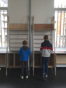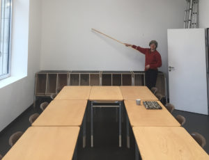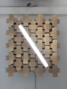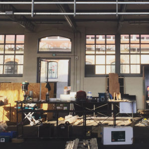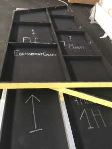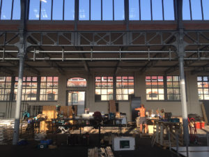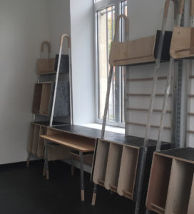 Le site des anciens abattoirs de Nancy a été réhabilité petit à petit. Après la livraison de la Grande Halle, c’est au tour des deux octrois et de la halle aux moutons. Pour nous, il s’agit d’imaginer et de fabriquer l’aménagerment intérieur de l’ensemble du site avec des matériaux de récupération des ateliers municipaux de la Ville et des greniers de l’Opéra. L’ensemble du décors de l’Opéra de Katia Kabanova a été détourné pour imaginer un aménagement adapté. L’idée de départ a été ré-interrogée en fonction des matériuax récupérés, les portiques alu sont devenus supports de caissons réalisés avec le praticable de la pièce en panneaux contreplaqués filmé noir.