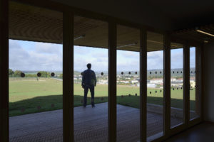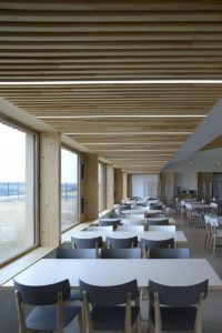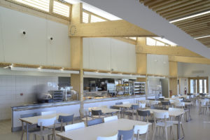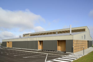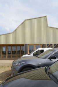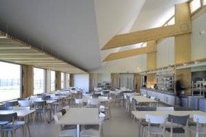 Sur les hauts de la ville de Commercy, le restaurant offre un panorama étonnant sur la vallée de la Meuse. Pour ce bâtiment construit sur une zone industrielle, nous avons choisi de reprendre le vocabulaire d’une architecture économique: un bardage métallique sur une ossature bois isolée en laine de bois. Pour atteindre une bonne performance énergétique et compenser la façade vitrée au nord, offrant la vue à la salle de restauration, le toit se soulève au-dessus de la partie cuisine très fermée, pour bénéficier des apports solaires du sud. Un maillage de bois en second plan habille les entrées sur les façades pignons.